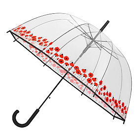 Větruodolný, průhledný klenutý deštník od holandské značky Falconetti. S automatickým otevíráním a s vlčími máky po obvodu deštníku.