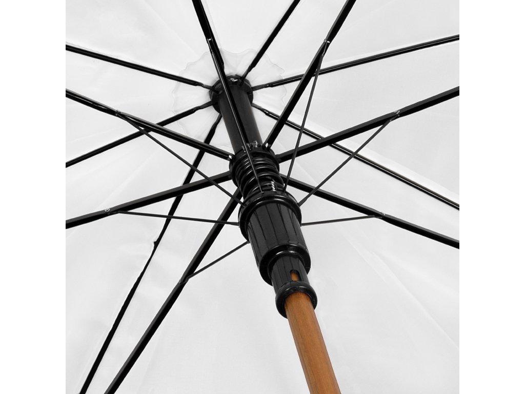 Dřevěná hůl, rukojeť, špička a koncovky drátů dávají tomuto deštníku nestárnoucí eleganci.